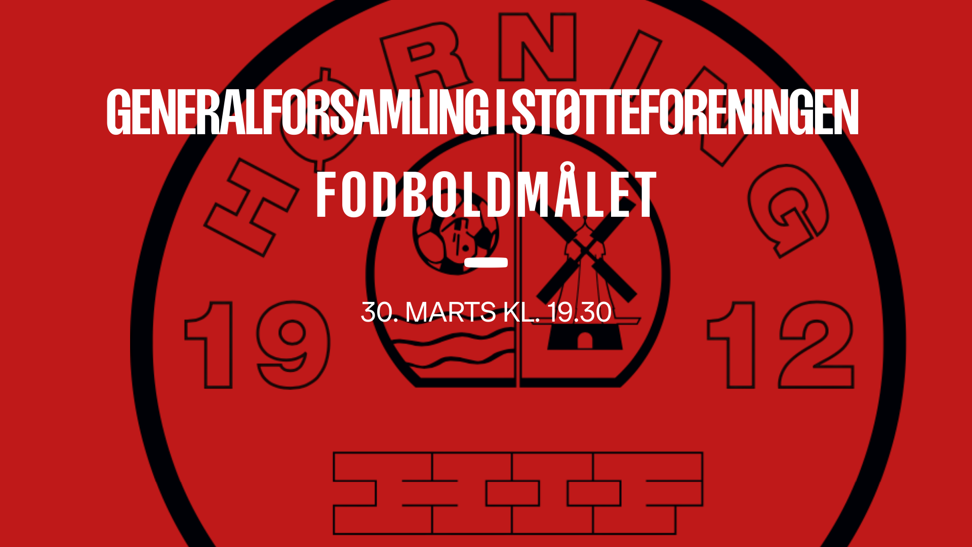 Mandag den 30. marts 2026 kl. 19.30 afholder Støtteforeningen Fodboldmålet deres årlige generalforsamling i Hørning Idrætscenter. Dagsorden i henhold til vedtægterne.